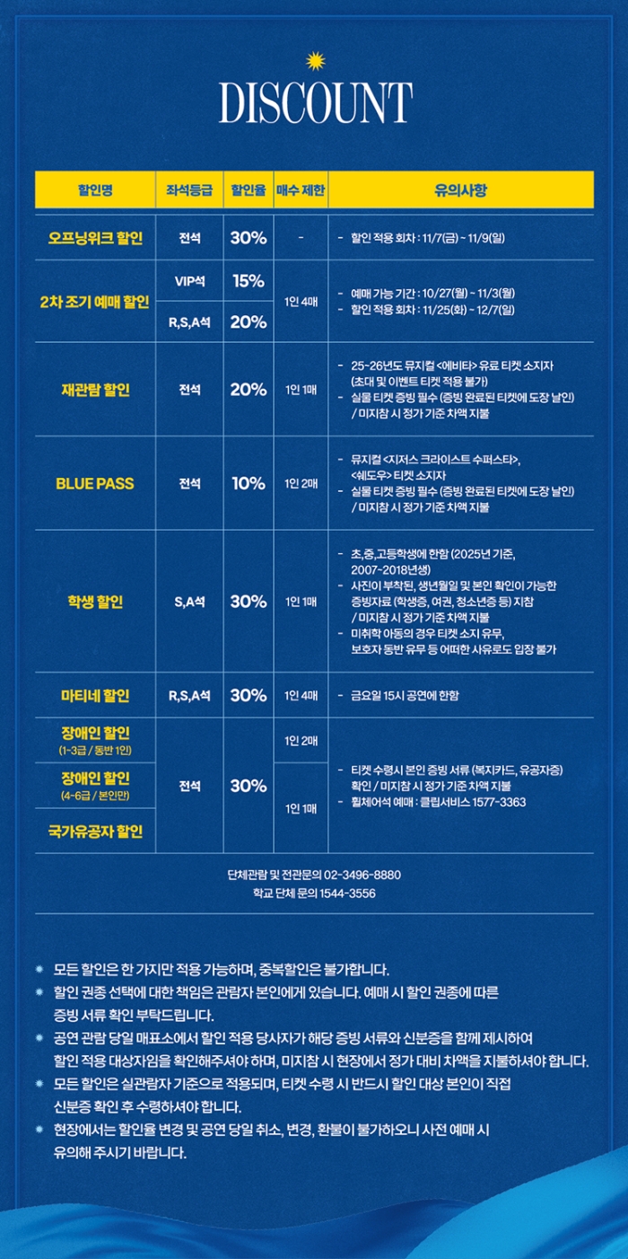 | 유효기간(이용조건) | 2025년11월07일(금) ~ 2026년01월11일(일) (예매한 공연일시에 한해 이용 가능) | ||||||||