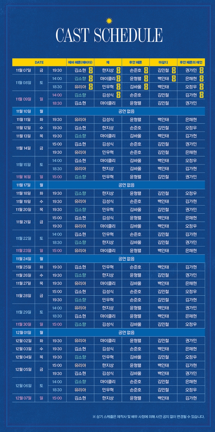 - 화~목 오후 7시30분 / 금 3시, 7시30분 / 토 2시, 6시30분 / 일 3시 (월 공연없음)