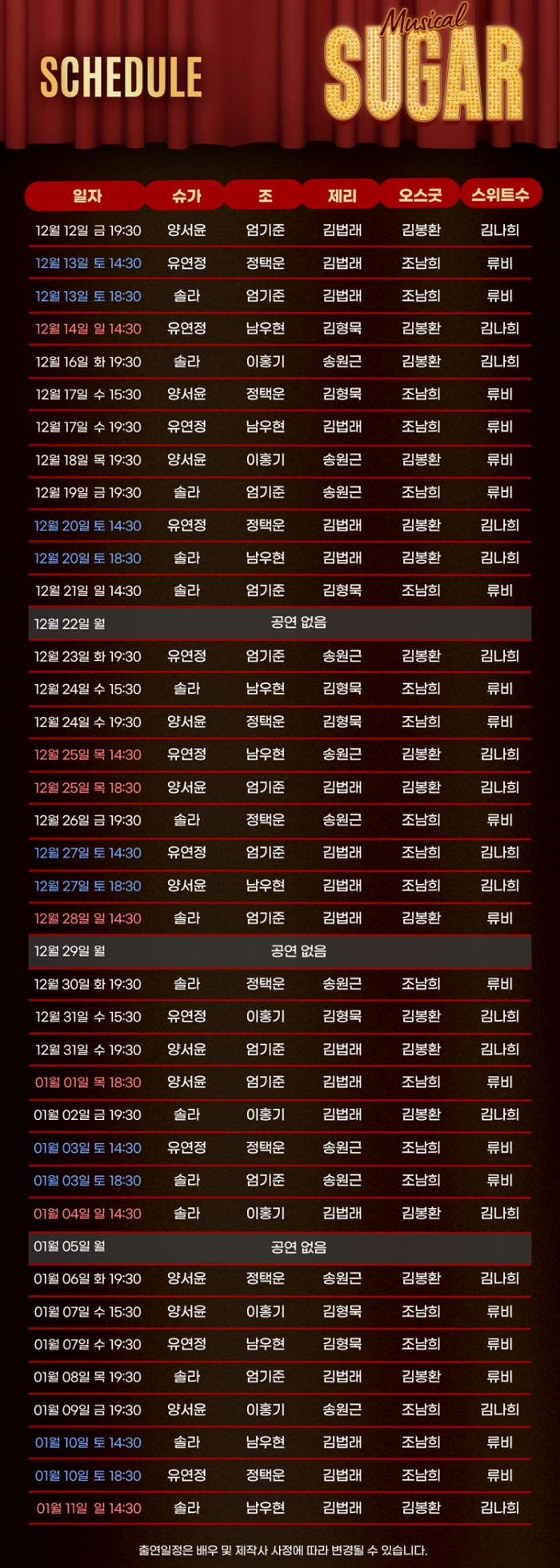 - 화, 목, 금 오후 7시30분 / 수 3시30분, 7시30분 / 토, 공휴일 2시30분, 6시30분 / 일 2시30분 (월 공연없음)