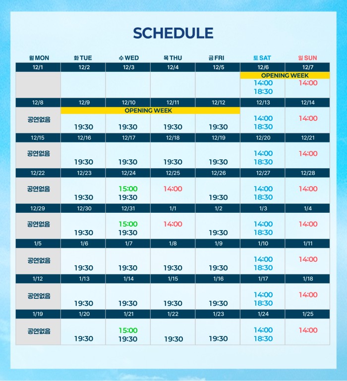 - 화~금 오후 7시30분 / 토 2시, 6시30분 / 일요일 및 공휴일 2시