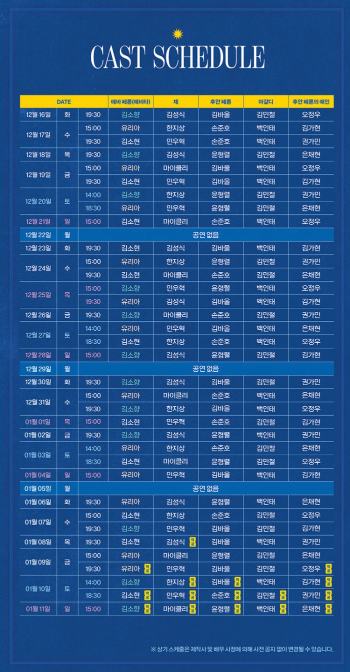 - 화, 목 오후 7시30분 / 수, 금 3시, 7시30분 / 토 2시, 6시30분 / 일 3시 (월 공연없음)