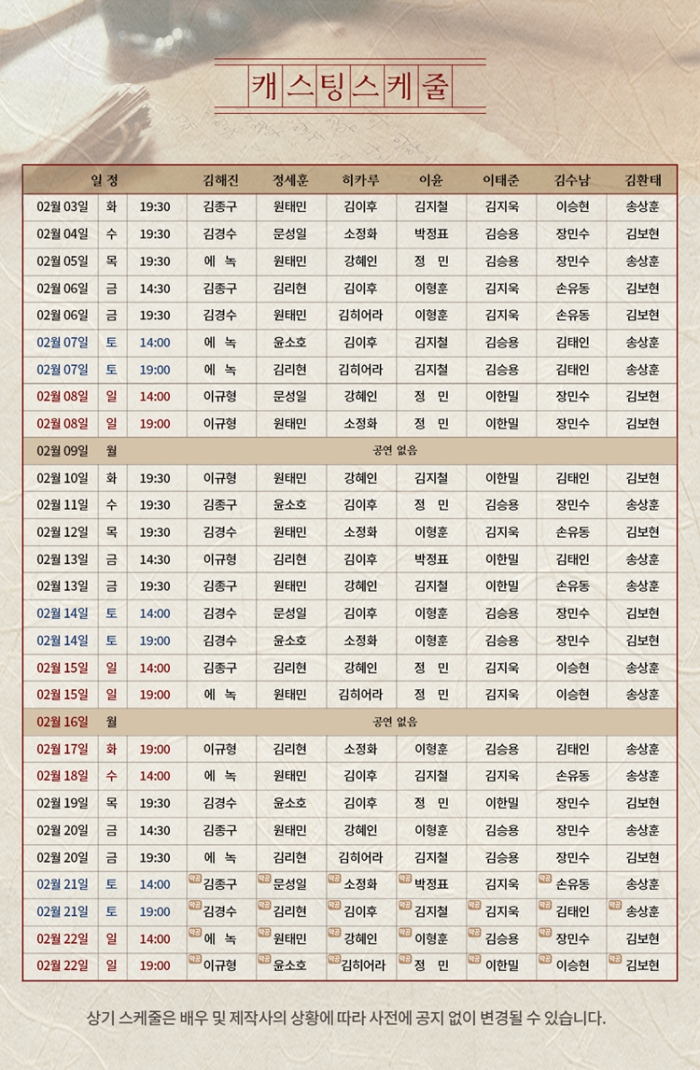 - 화, 수, 목 오후 7시30분 / 금 2시30분, 7시30분 / 토, 일 2시, 7시 (월 공연없음)
