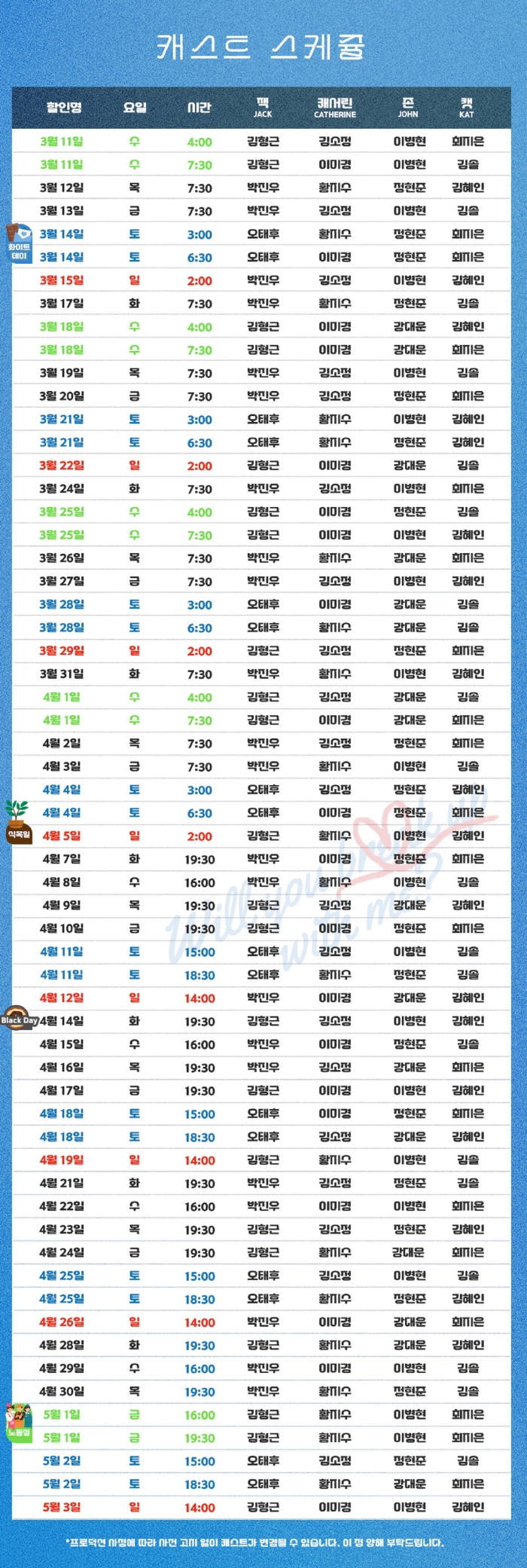*03/18(수), 03/25(수), 04/01(수), 05/01(금) 오후 4시, 7시30분