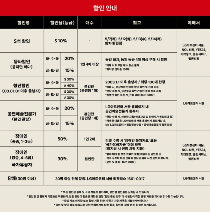 | 판매자(발행자) | LG아트센터 서울 티켓박스 | 고객문의(소비자상담) | 1661-0017 | ||||||