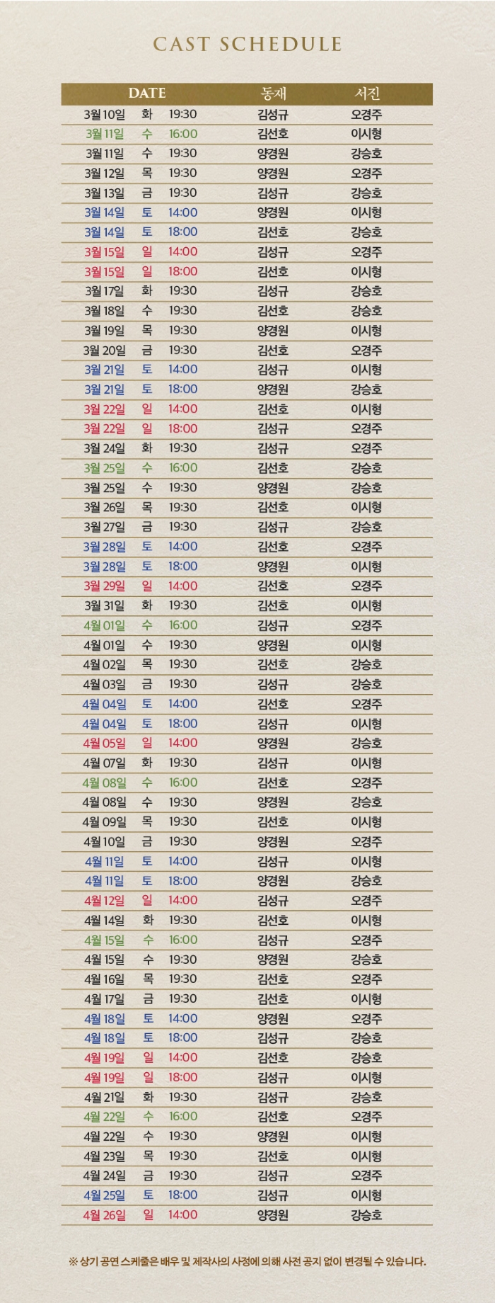 - 화, 목, 금 오후 7시30분 / 수 4시, 7시30분 / 토, 일 2시, 6시 (월 공연없음)