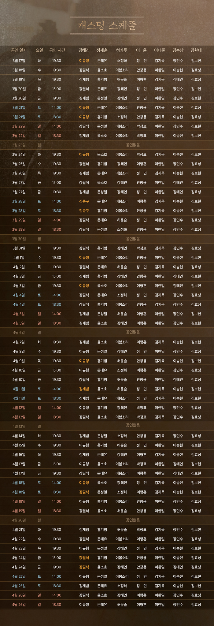 - 화, 수, 목 오후 7시30분 / 금 3시, 7시30분 / 주말 및 공휴일 2시, 6시30분 (월 공연없음)