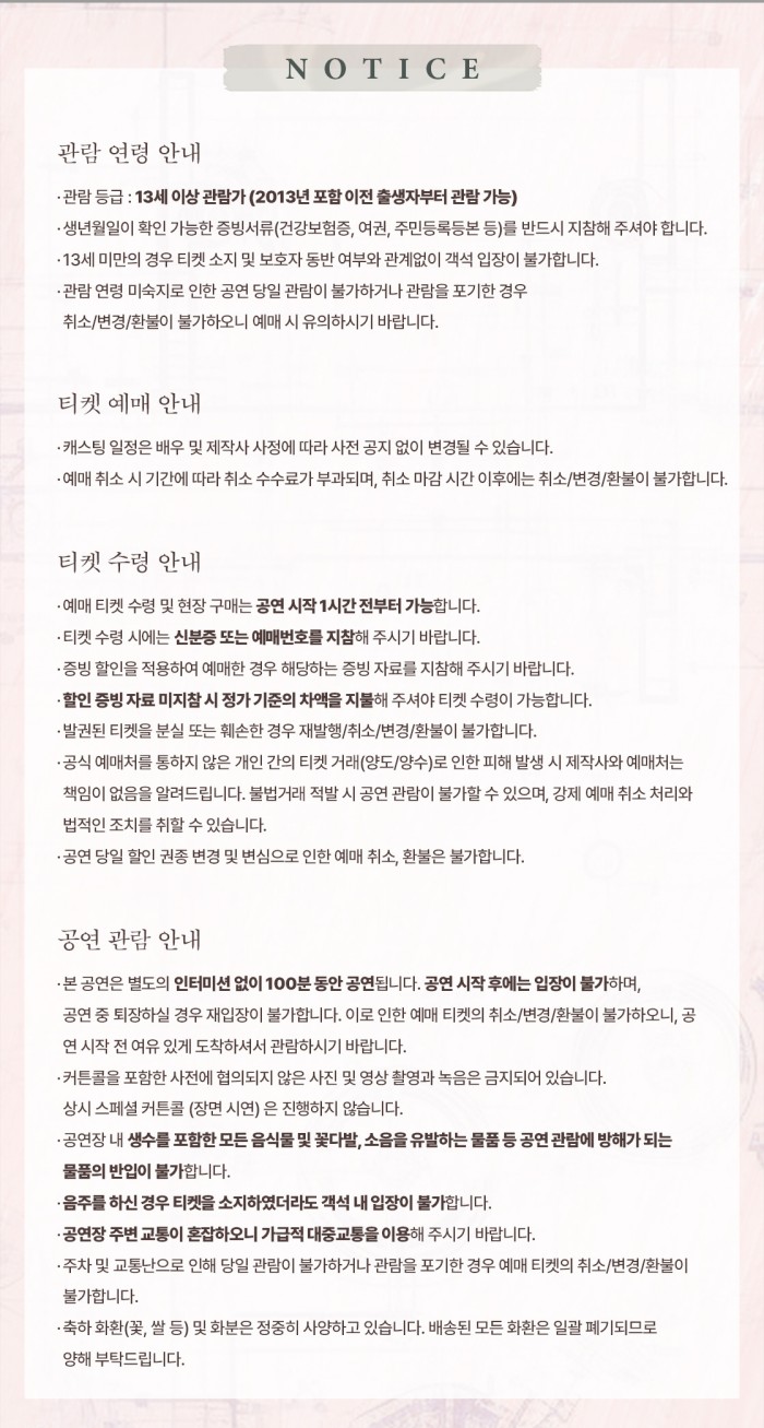 | 유효기간(이용조건) | 2026년03월21일(토) ~ 04월19일(일) (예매한 공연일시에 한해 이용 가능) | ||||||||