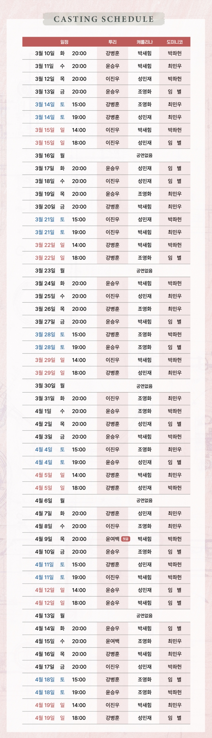 - 화~금 오후 8시 / 토 3시, 7시 / 일 및 공휴일 2시, 6시 (월 공연없음)